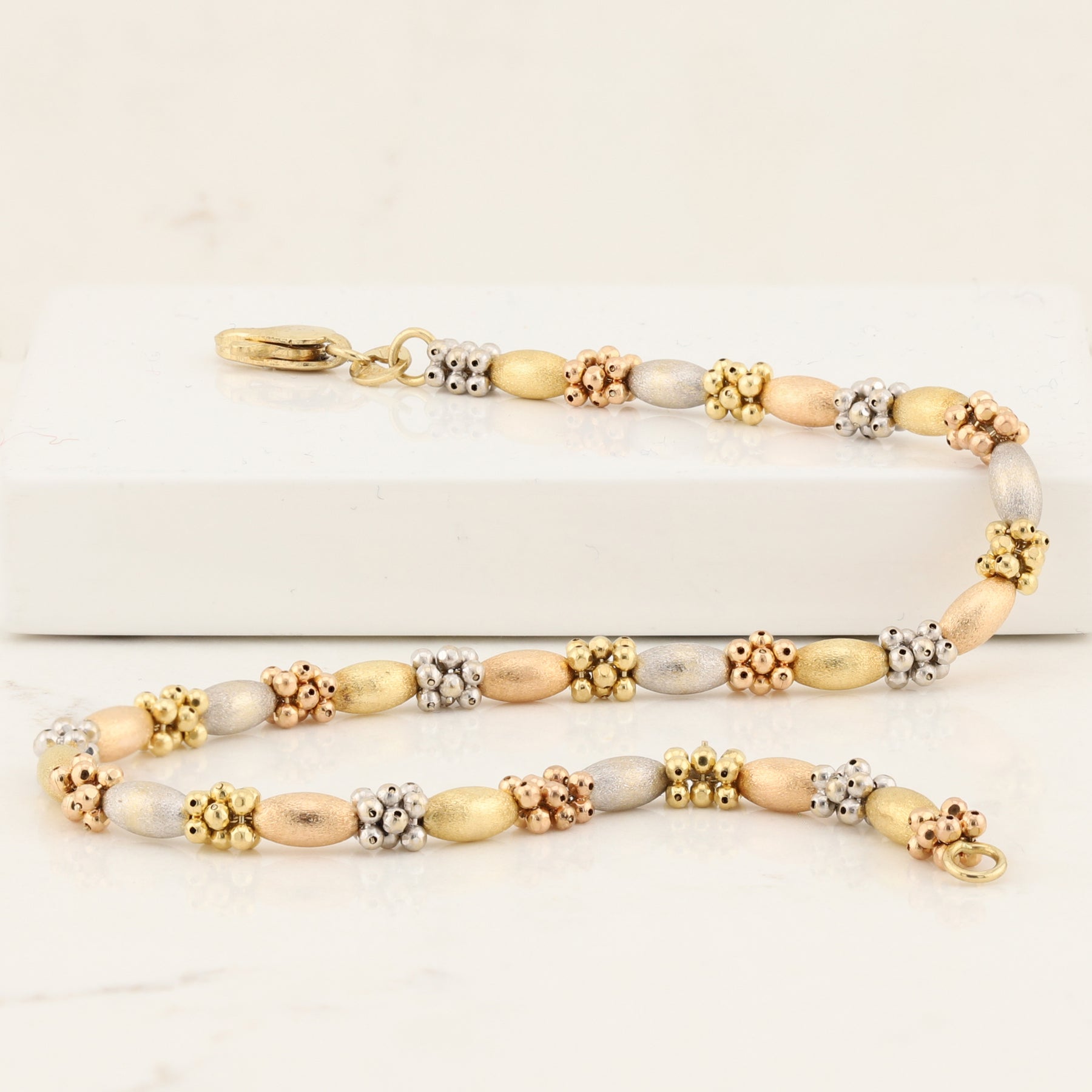 Tri Colour 18kt Gold Bead Bracelet, in rose, white and yellow gold stung on yellow gold chain with a lobster claw clasp. The bracelet is 8 inches in length.