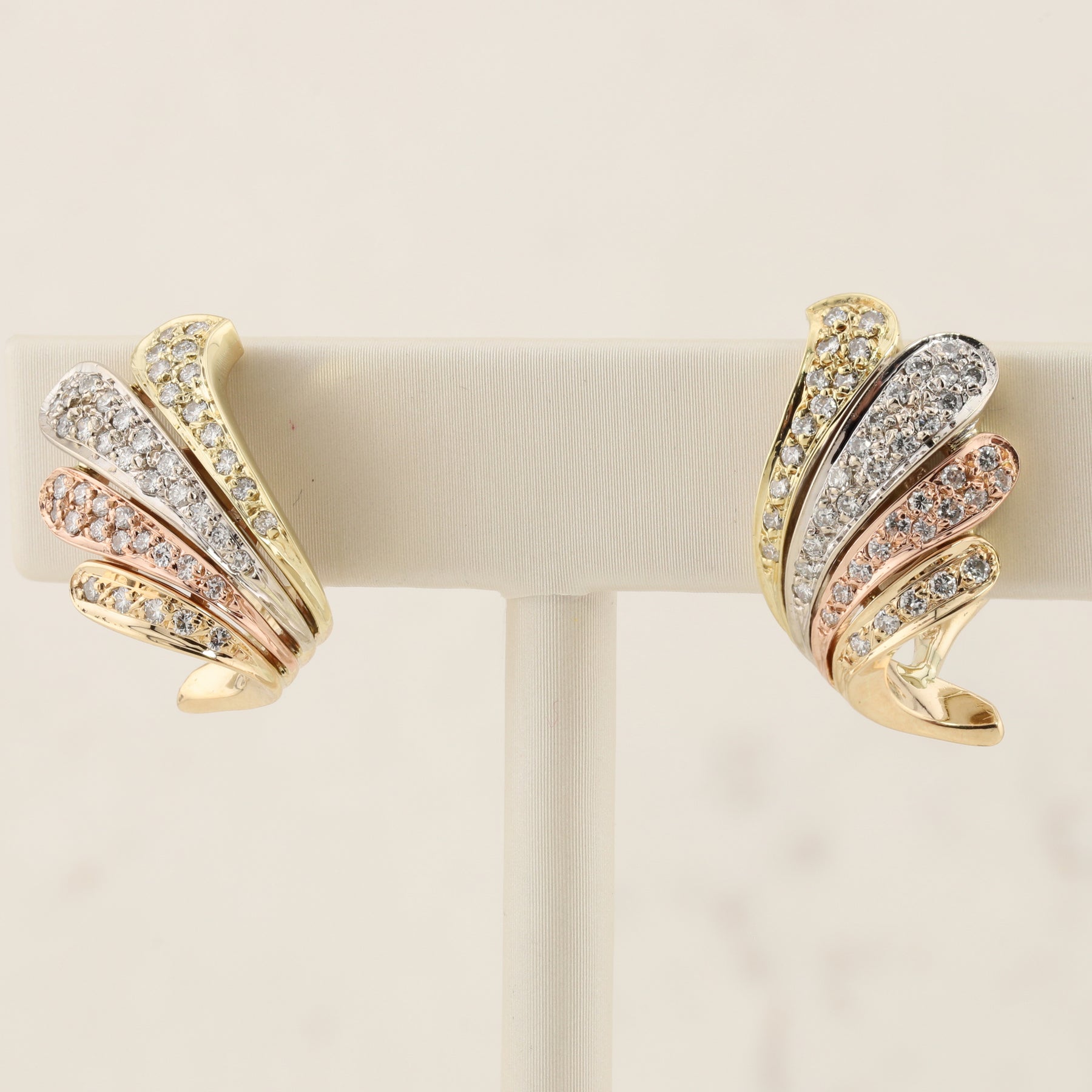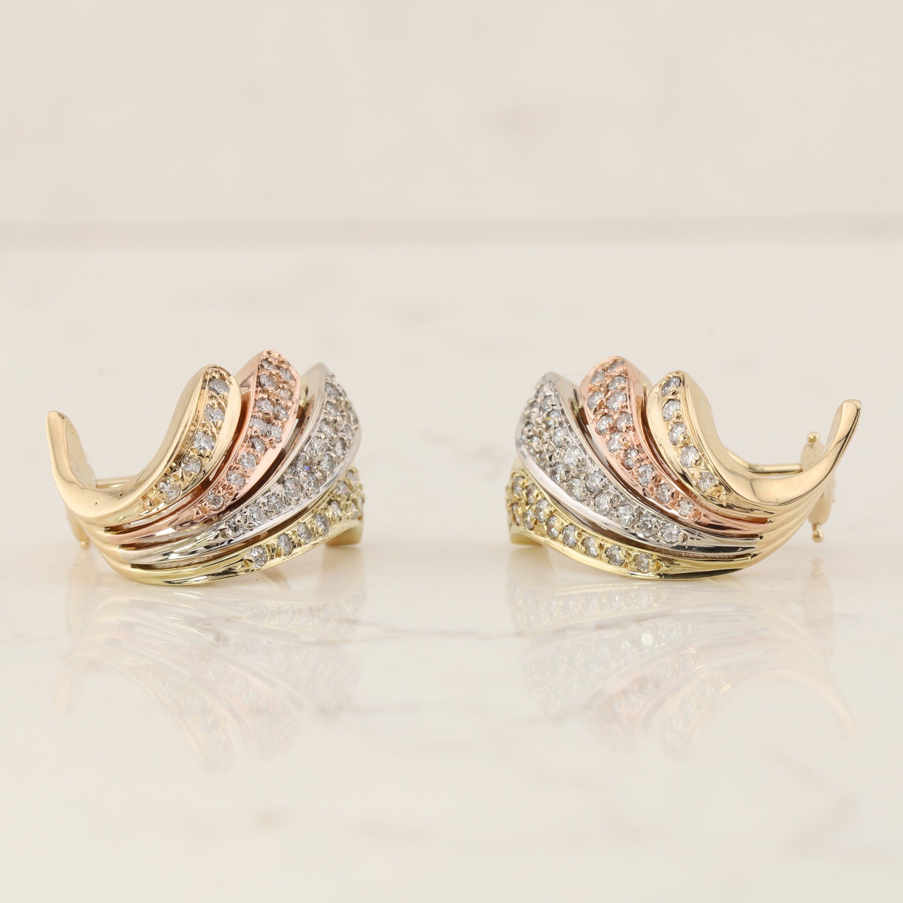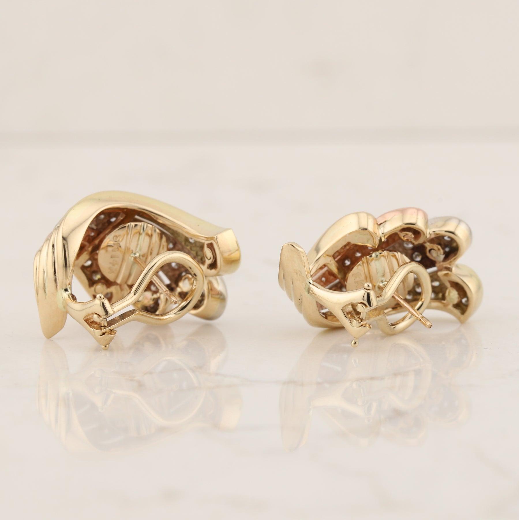 These gorgeous earrings are loaded with colour and sparkle, set in a pavé style with diamonds, on every plume in rose yellow and white. They have the ever-popular omega backings, needed to support these diamond earrings.