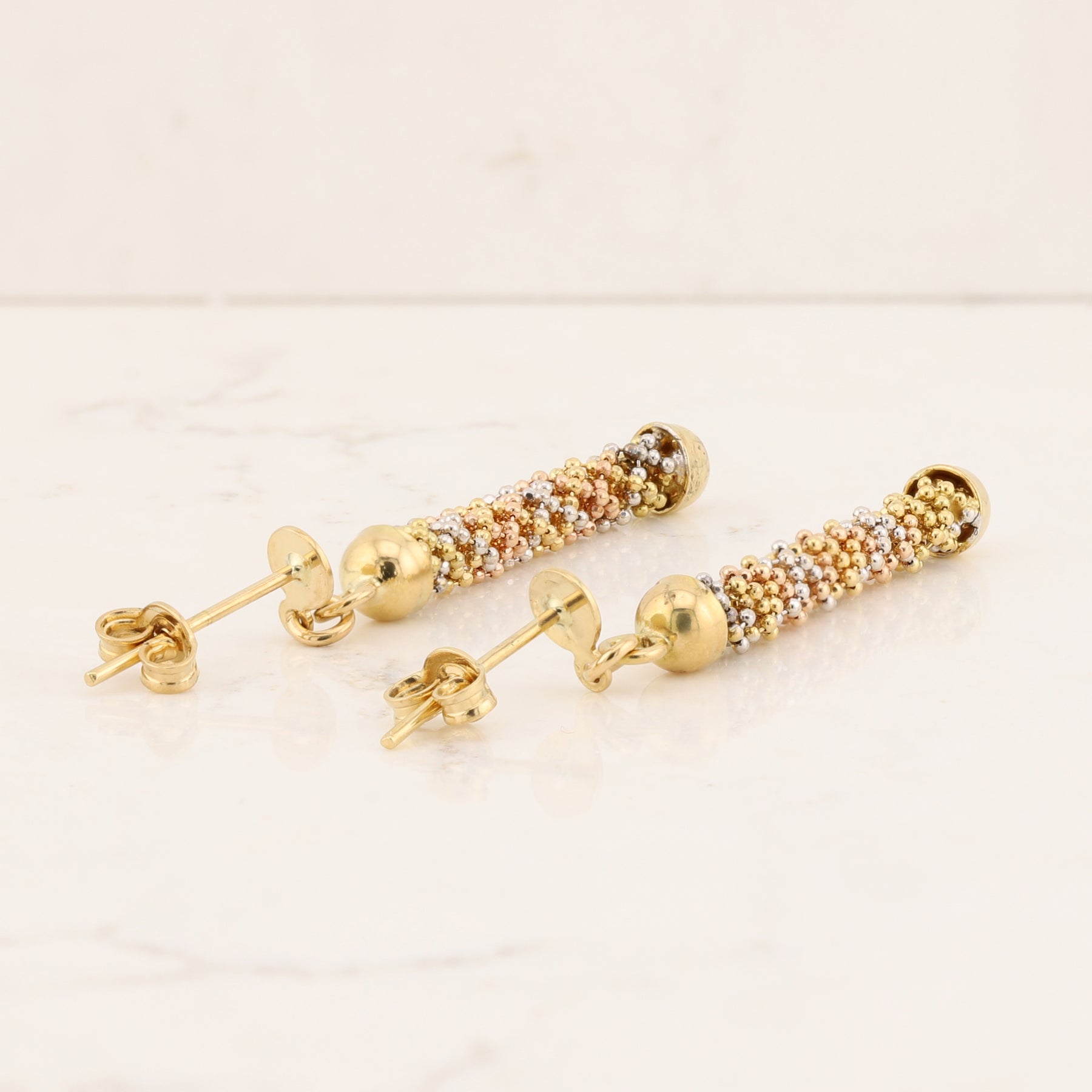 Drop style, woven bead ball chain drop earrings, in 18kt yellow, white and rose gold.