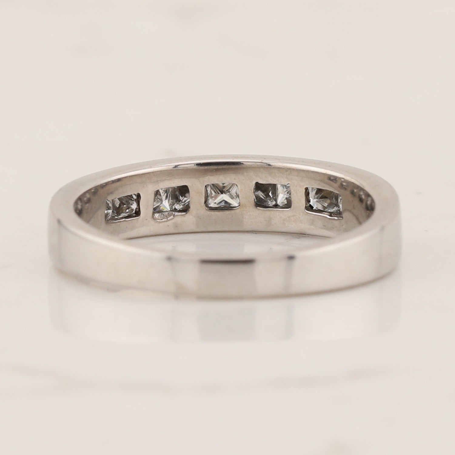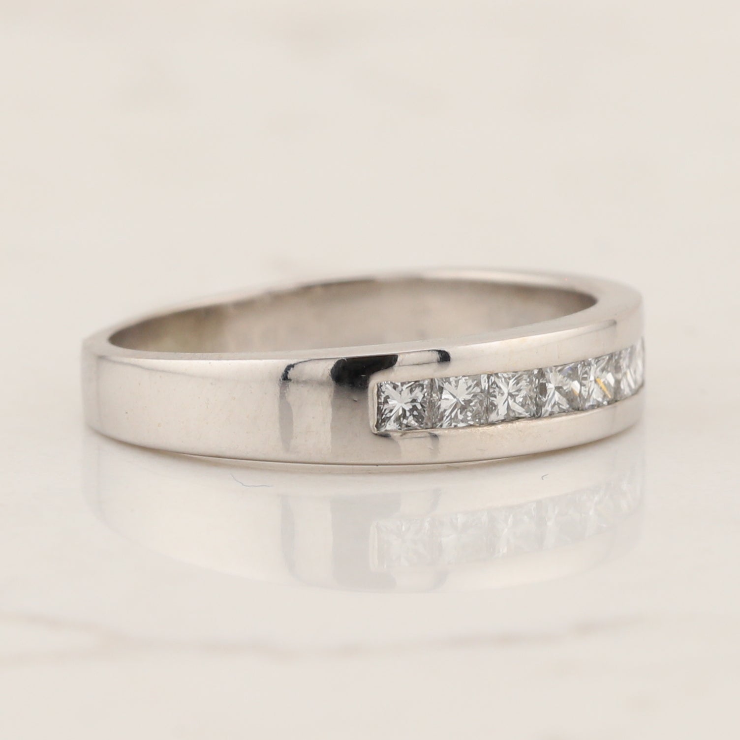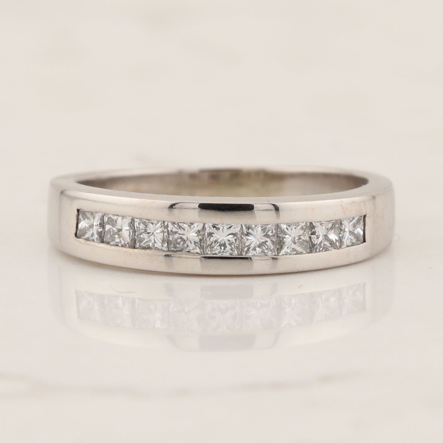 This 14kt white gold wedding band features princess cut diamonds totaling 0.36 carats with VS2 to SI1 clarity. The ring is a size 6.5.