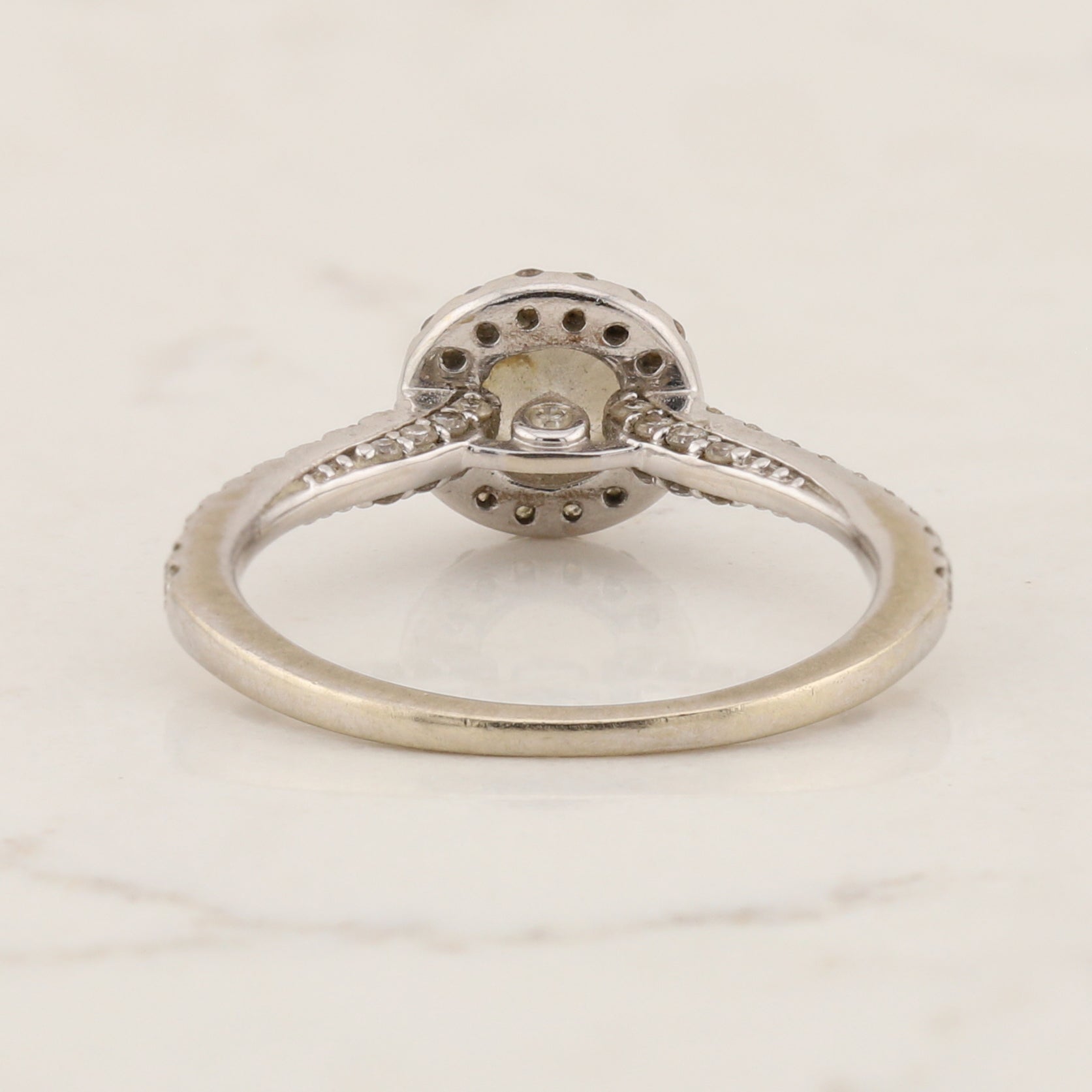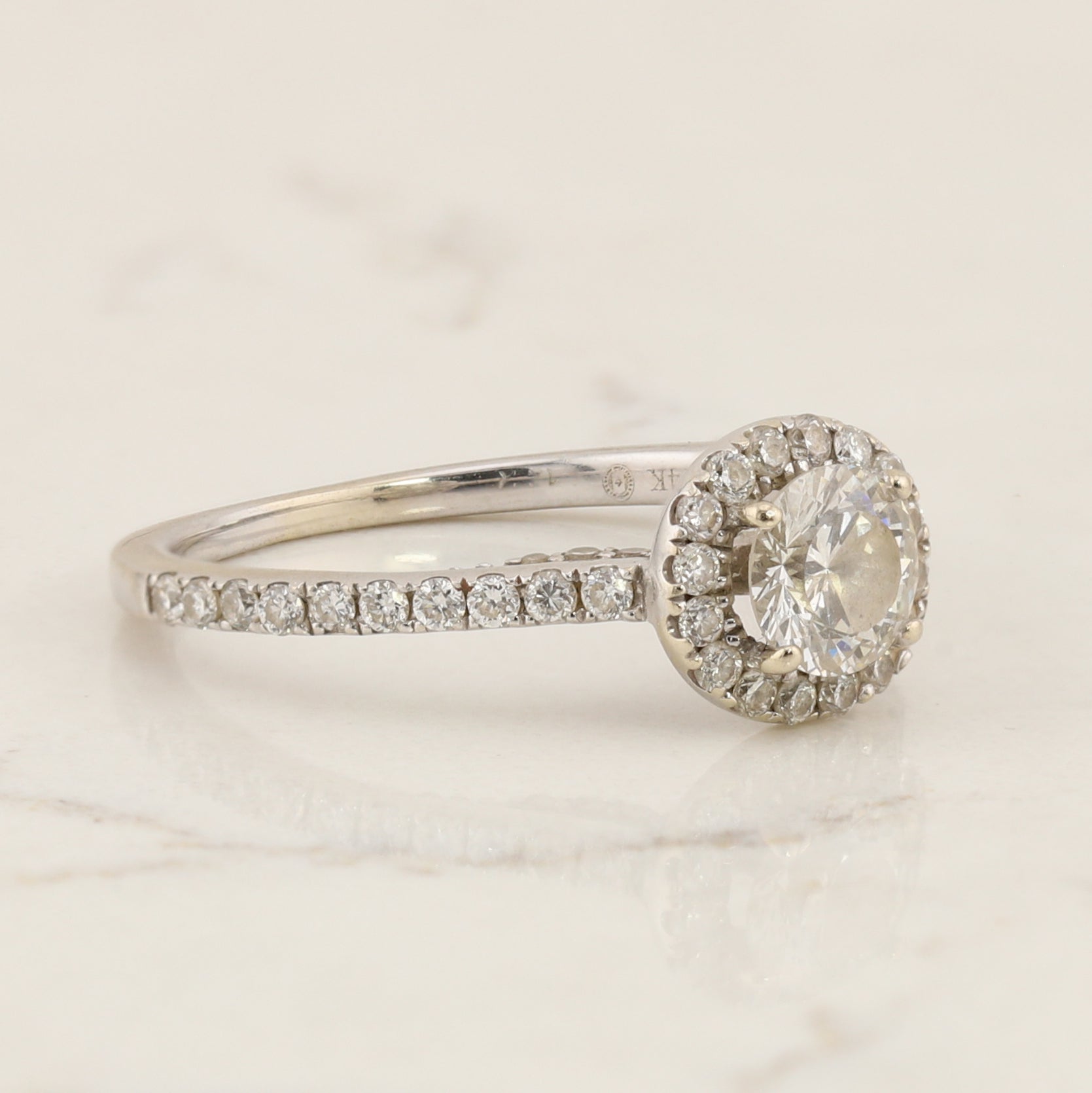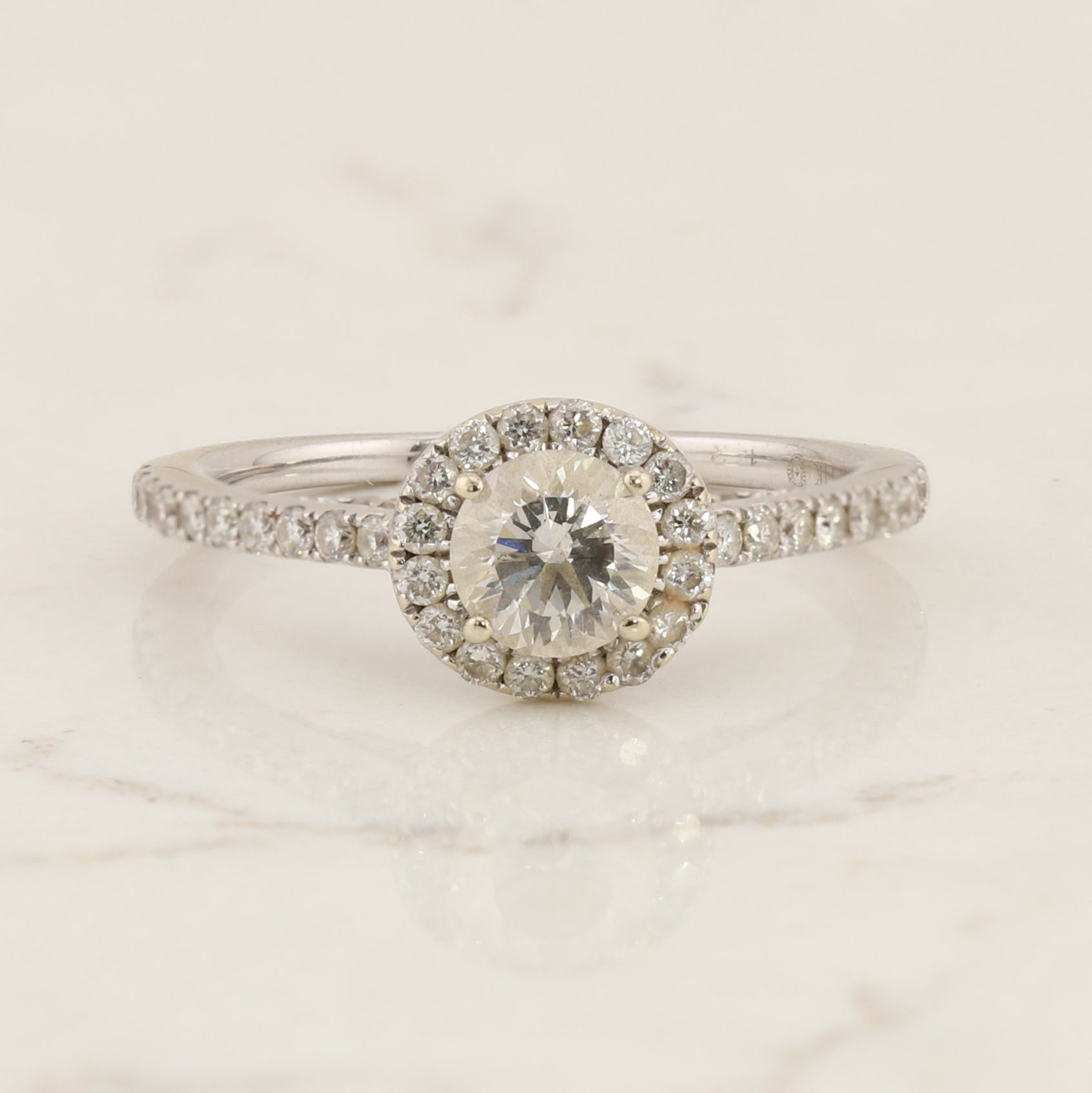This 14kt white gold ring has a 0.50 carat diamond at its centre, surrounded by 0.08ct tdw diamonds in the halo and the shoulders of the ring.