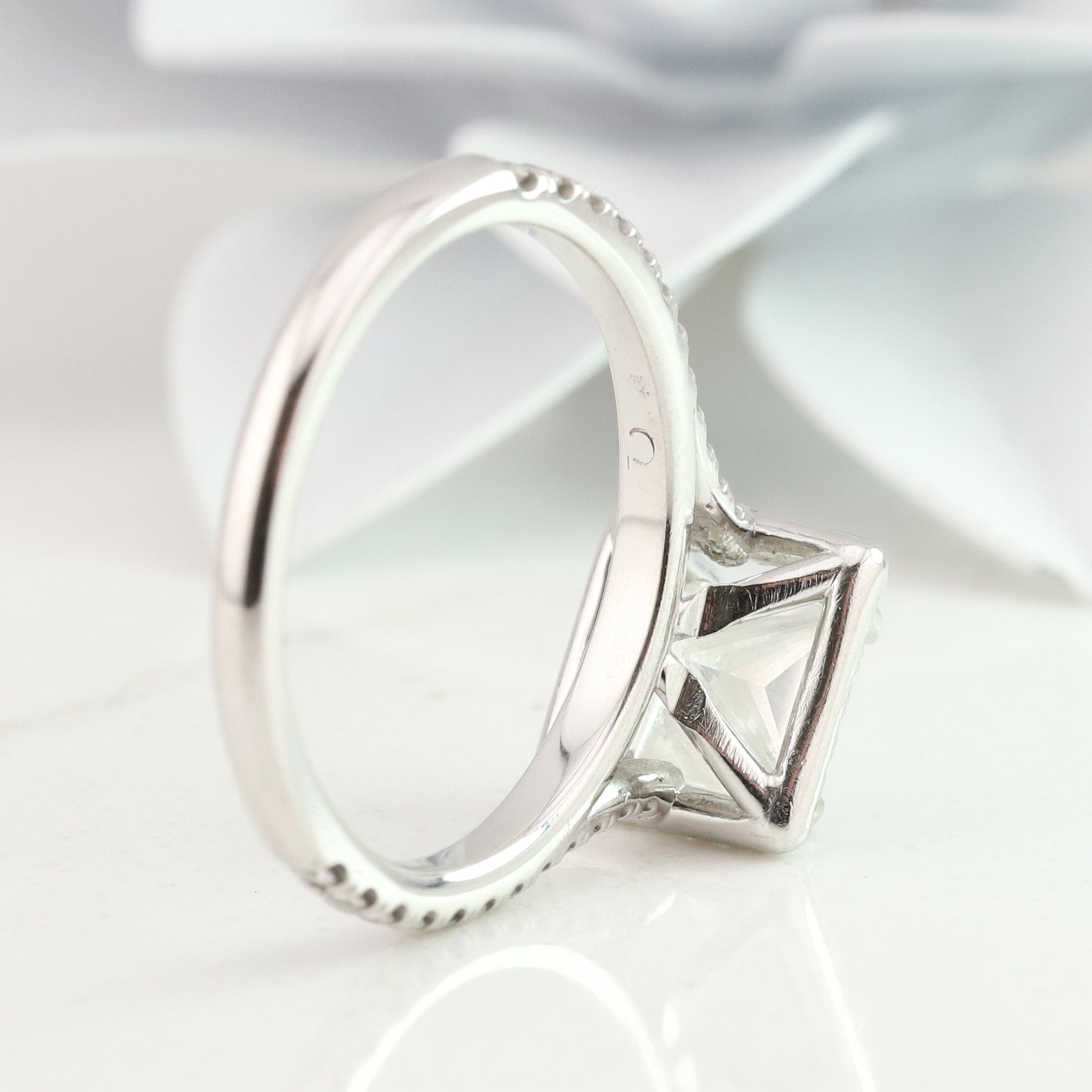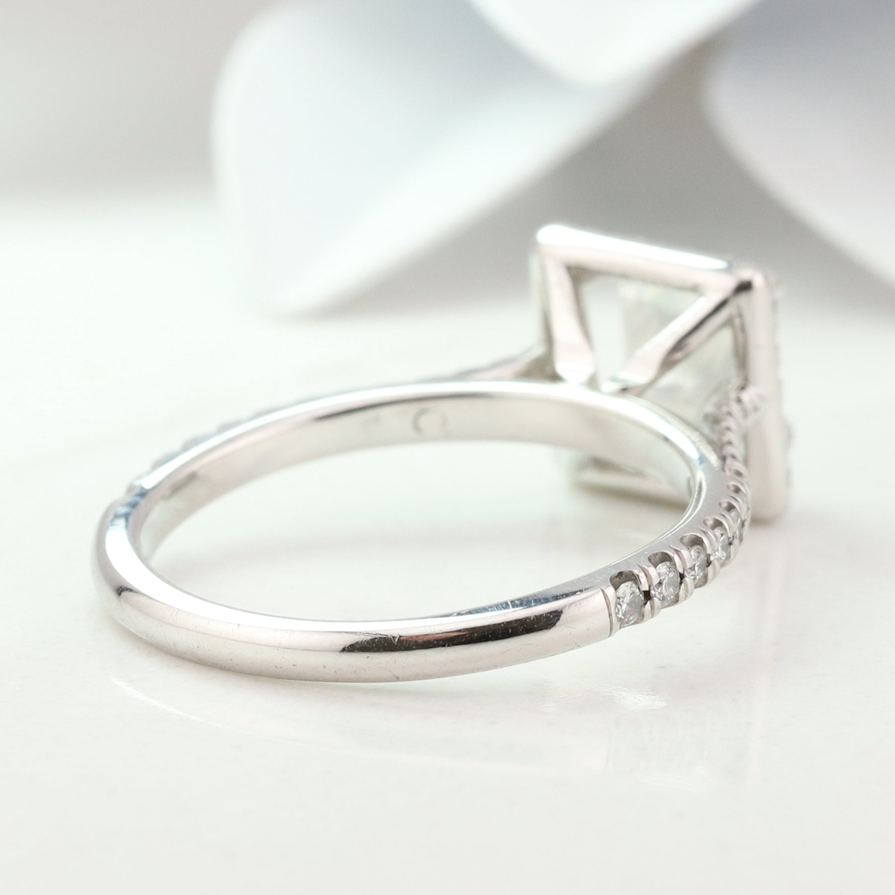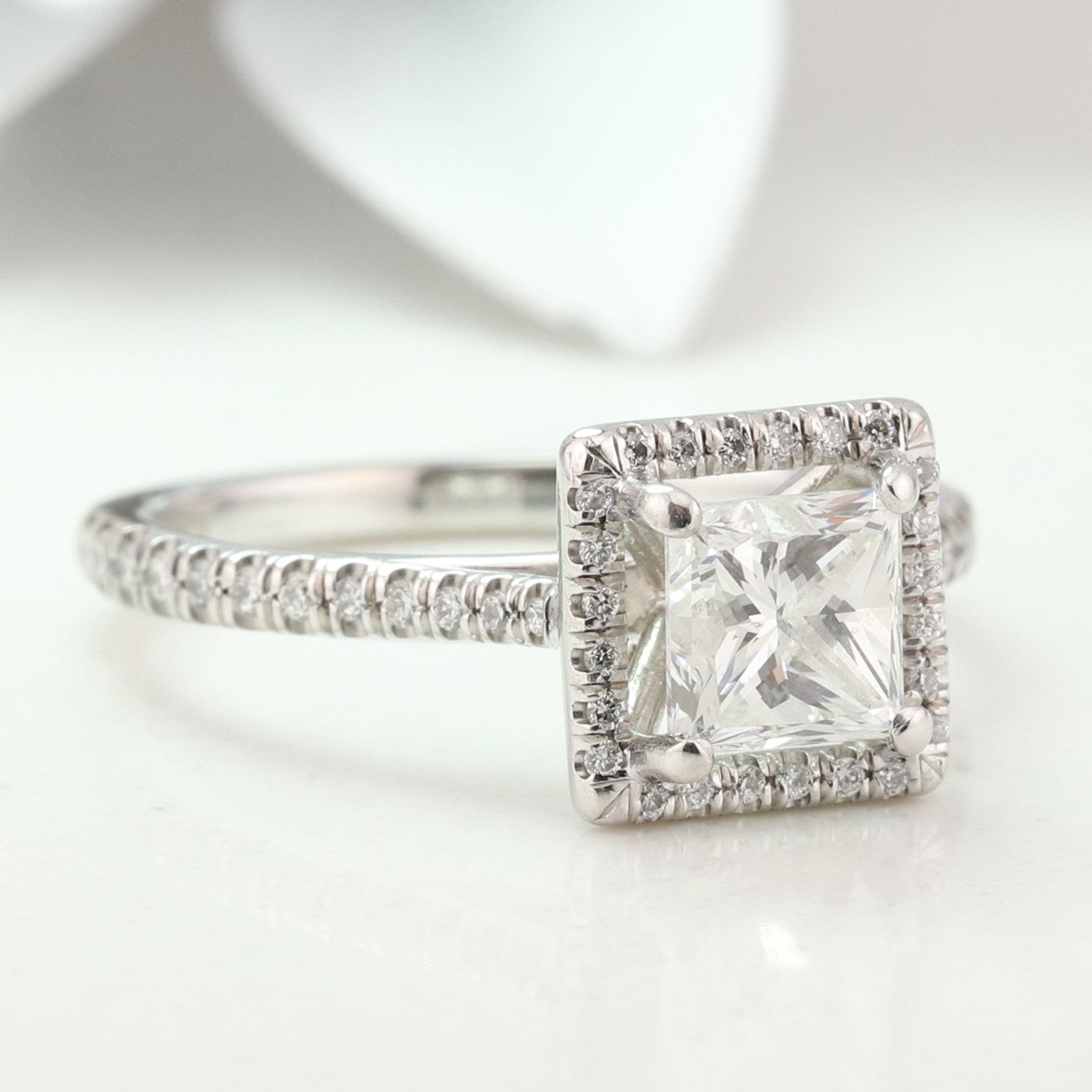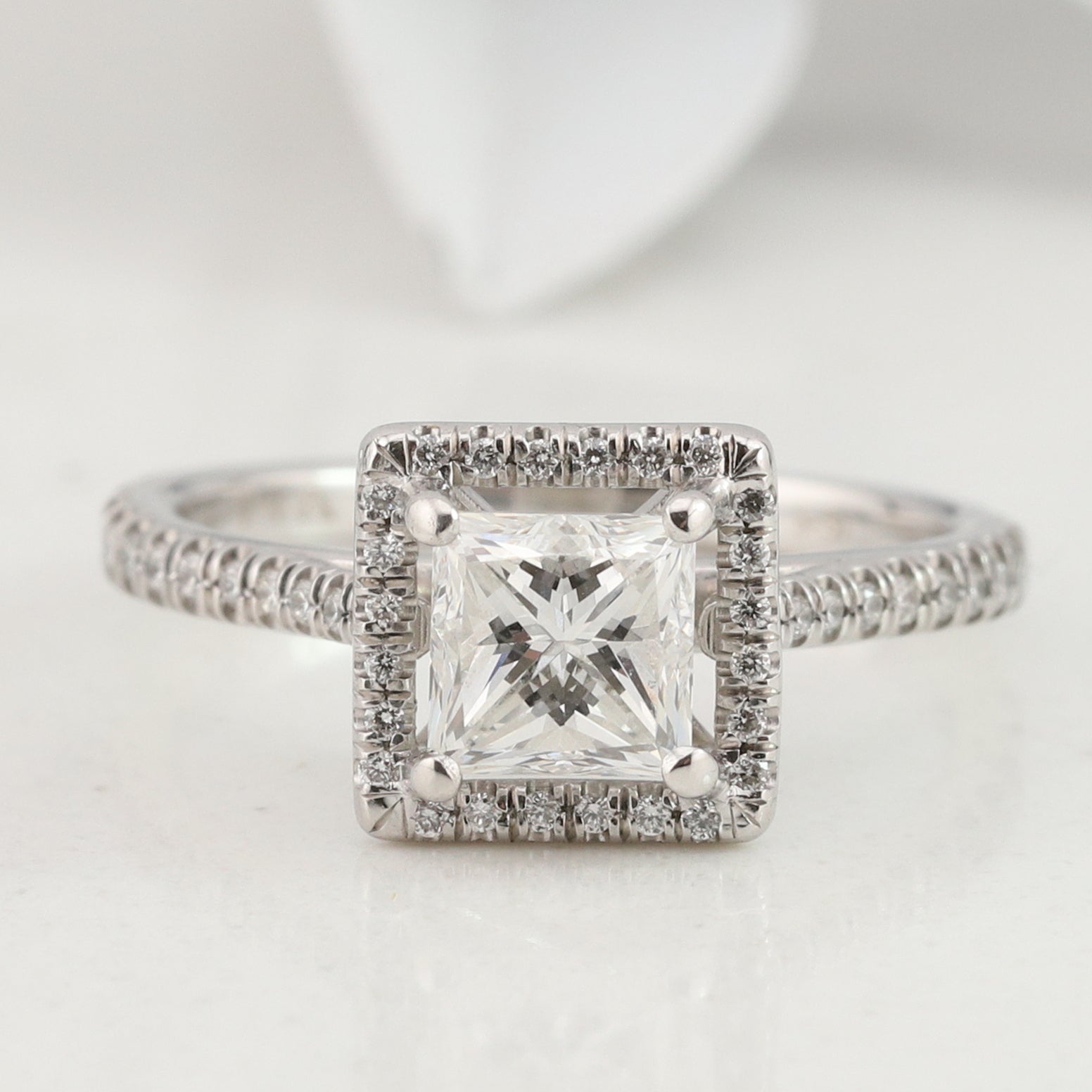 A beautiful 14kt white gold ring with a 0.60 carat princess cut diamond centre surrounded by diamonds on the halo and shoulders.  The ring is a size 5.25.
