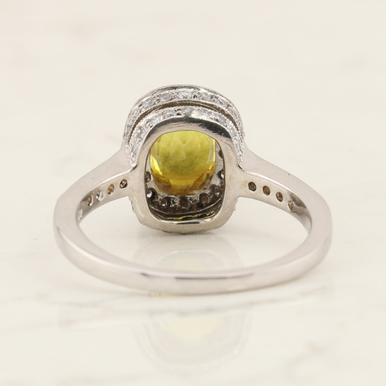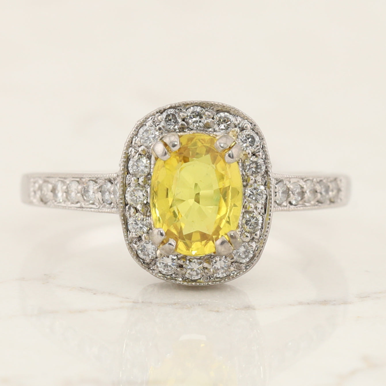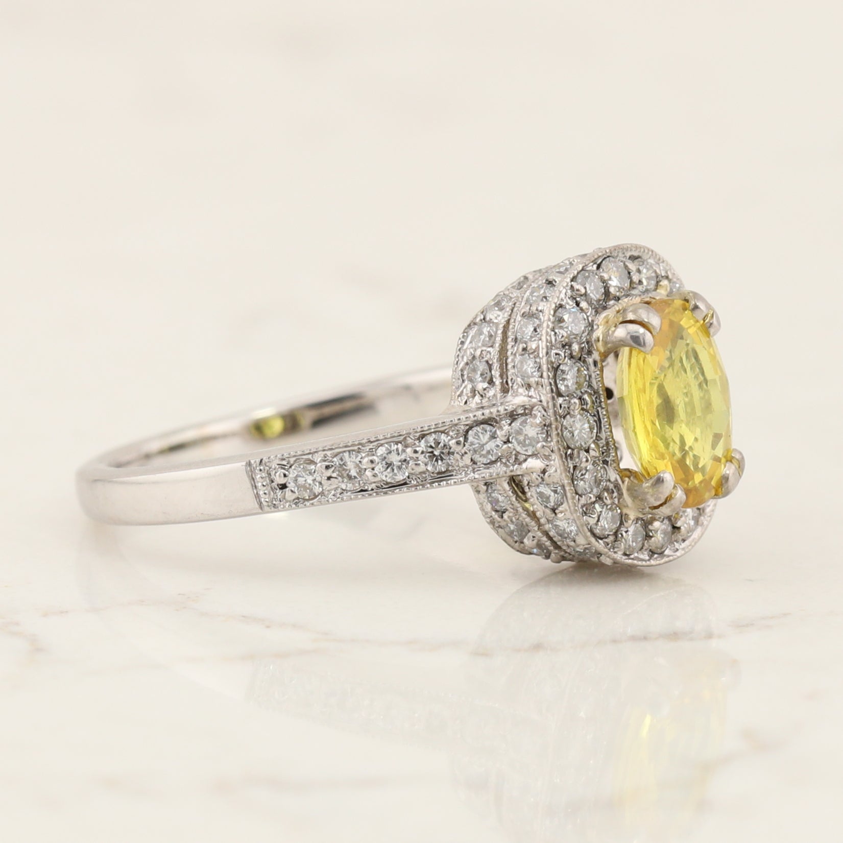 18kt white gold diamond halo, double gallery diamond set ring. The center stone is set with a 6mm x 8mm bright, oval diamond cut yellow sapphire. the ring is a finger size 8